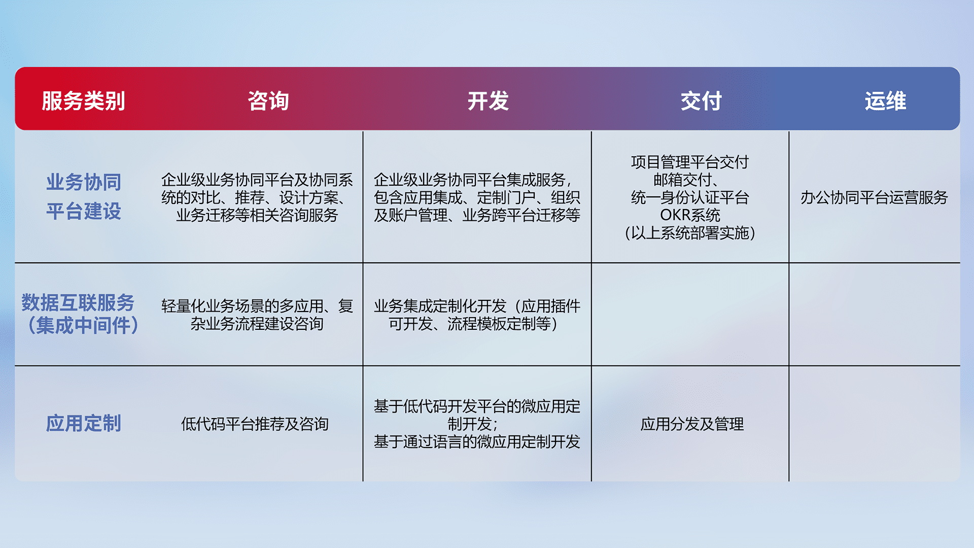 针对钉钉、、、企微、、IDaas等平台级产品提供产品的规划、、、方案、、、、交付、、定制化开发等服务,,实现如统一协同办公、、、智能客户服务、、、混合会议管理、、、、智能数据查询、、等业务场景,,,实现数字化转型。。。。